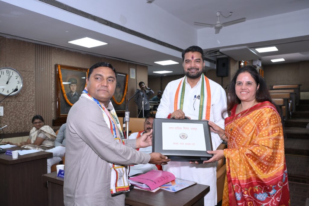रायपुर – रायपुर नगर पालिक निगम का वार्षिक बजट वित्त वर्ष 2026-27 को रायपुर नगर निगम की महापौर मीनल चौबे ने नगर निगम सभापति सूर्यकान्त राठौड़ के सभापतित्व में नगर निगम मुख्यालय भवन महात्मा गाँधी सदन के चतुर्थ तल पर स्थित नगर निगम सामान्य सभा सभागार में आहुत सामान्य सभा की बैठक में प्रस्तुत किया.