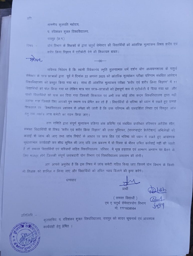 पंडित रविशंकर विश्वविद्यालय के शिक्षकों पर छात्राओं ने गंभीर आरोप लगाया है। छात्राओं का कहना है कि चौथे सेमेस्टर के आंतरिक मूल्यांकन परीक्षा जो कि 20 अंक का होता हैं जिसमें 1 1 नम्बर के लिए फेल कर दिया गया है। छात्राओं ने कुलसचिव और कुलपति को लिखित आवेदन दे कर फिर से पेपर जांचवाने की मांग की और जांच कमेटी बनाने की मांग की लेकिन विश्वविद्यालय ने इस पर कोई विचार नहीं किया।